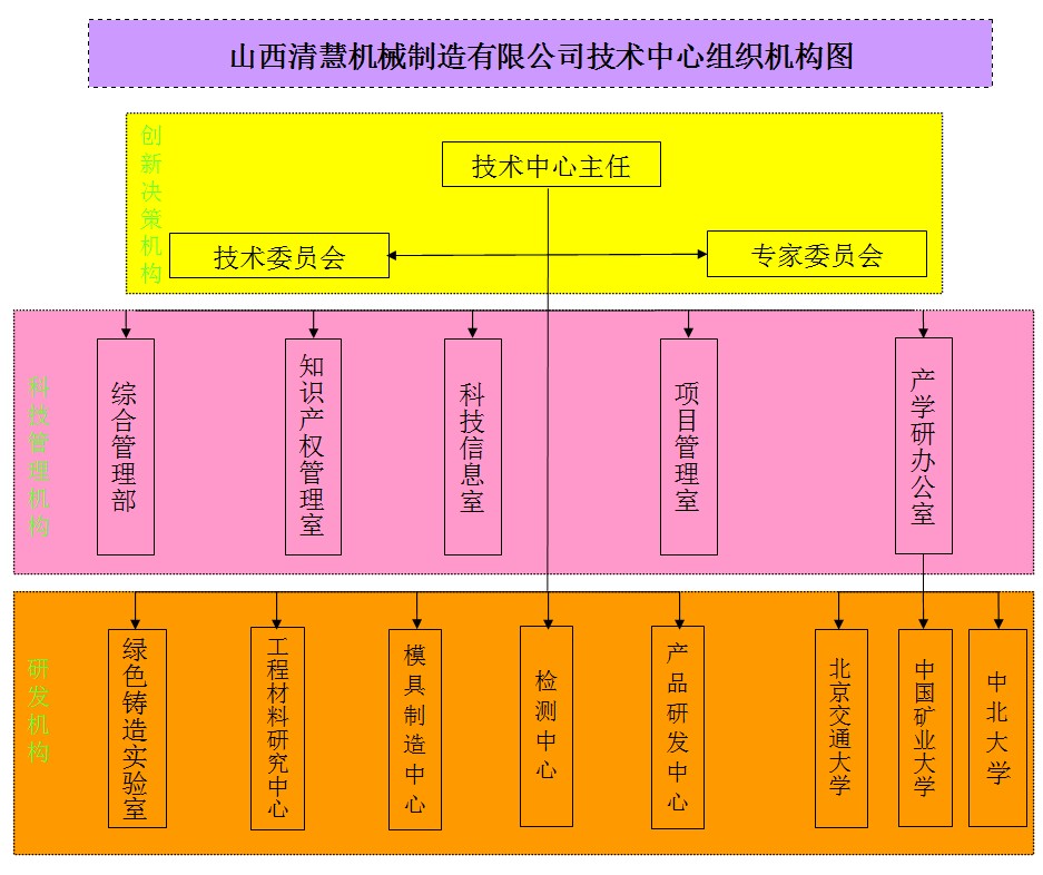 技術中心實行主任負責制,技術中心機構設置為"兩個委員會"和五個職能部門。即:專業委員會、技術委員會。綜合管理部、知識產權管理室、科技信息室、項目管理室、產學研辦公室。并進一步明確了各部門的職能,確立了以技術中心為研發依托的主導地位。