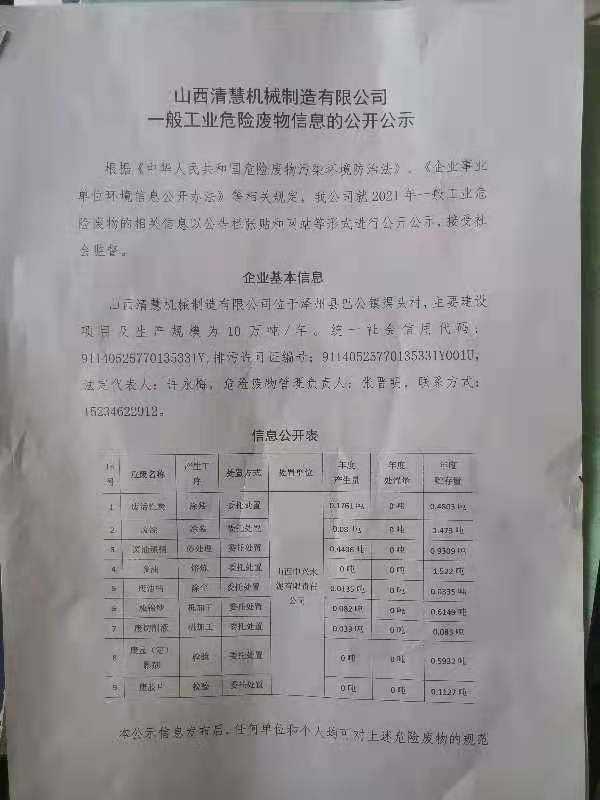 山西清慧機械制造有限公司一般工業危險廢物信息的公開公示