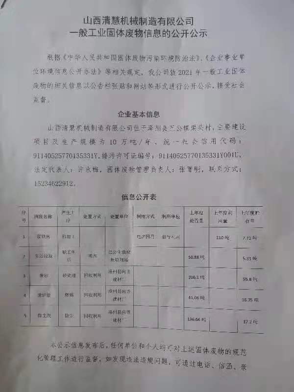 山西清慧機械制造有限公司一般工業固體廢物信息的公開公示